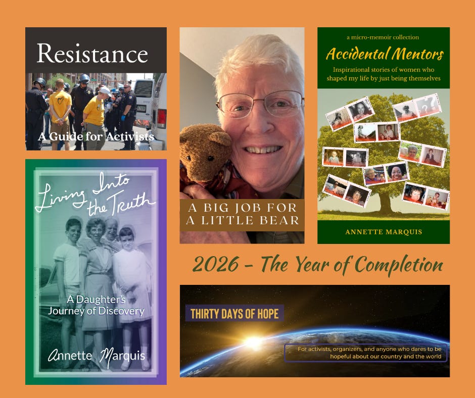 Over those two and a half years, I serialized two memoirs on Substack, Accidental Mentors: Inspirational Stories of Women Who Shaped My Life by Just Being Themselves, and Living Into the Truth: A Daughter’s Journey of Discovery (which I’ve since published in print and e-book formats), and published one inspirational series: Thirty Days of Hope, one beloved (at least by me) short-story, “A Big Job for a Little Bear,” and a fair number of posts on other topics, including in my Wandering WordsWomen series.