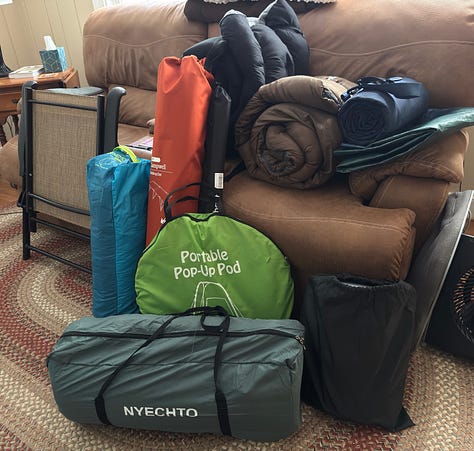 Our new roomy tent was perfect—until I tried setting it up alone. Smaller pop-up tents I tested were easier, but too low to crawl into and too small for a cot. I began exploring other options—state park cabins, KOA cabins, renting RVs, etc.—but the idea of tent camping kept nagging at me.