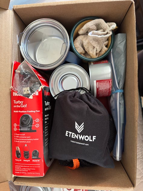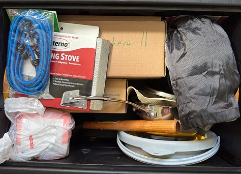 I spent the next couple of weeks assembling the rest of my camping gear: cooler, tarp, cot, sleeping pad, sleeping bag, pillow, telescoping tarp poles, camp chair, kitchen and fire accessories, and all the other basics to stay warm and comfortable out in the wild!