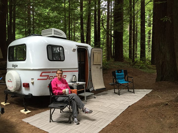 In 2015, Wendy and I bought an egg camper, ‘Idgie,’ with a stove, fridge, and table/bed. By 2018, we upgraded to a sleek Winnebago Travato, complete with solar power, shower, and writing desk. Blissful but expensive, we adventured in “Wanda” (Wendy and Annette) three years before we sold her at the end of the pandemic for a surprising profit.