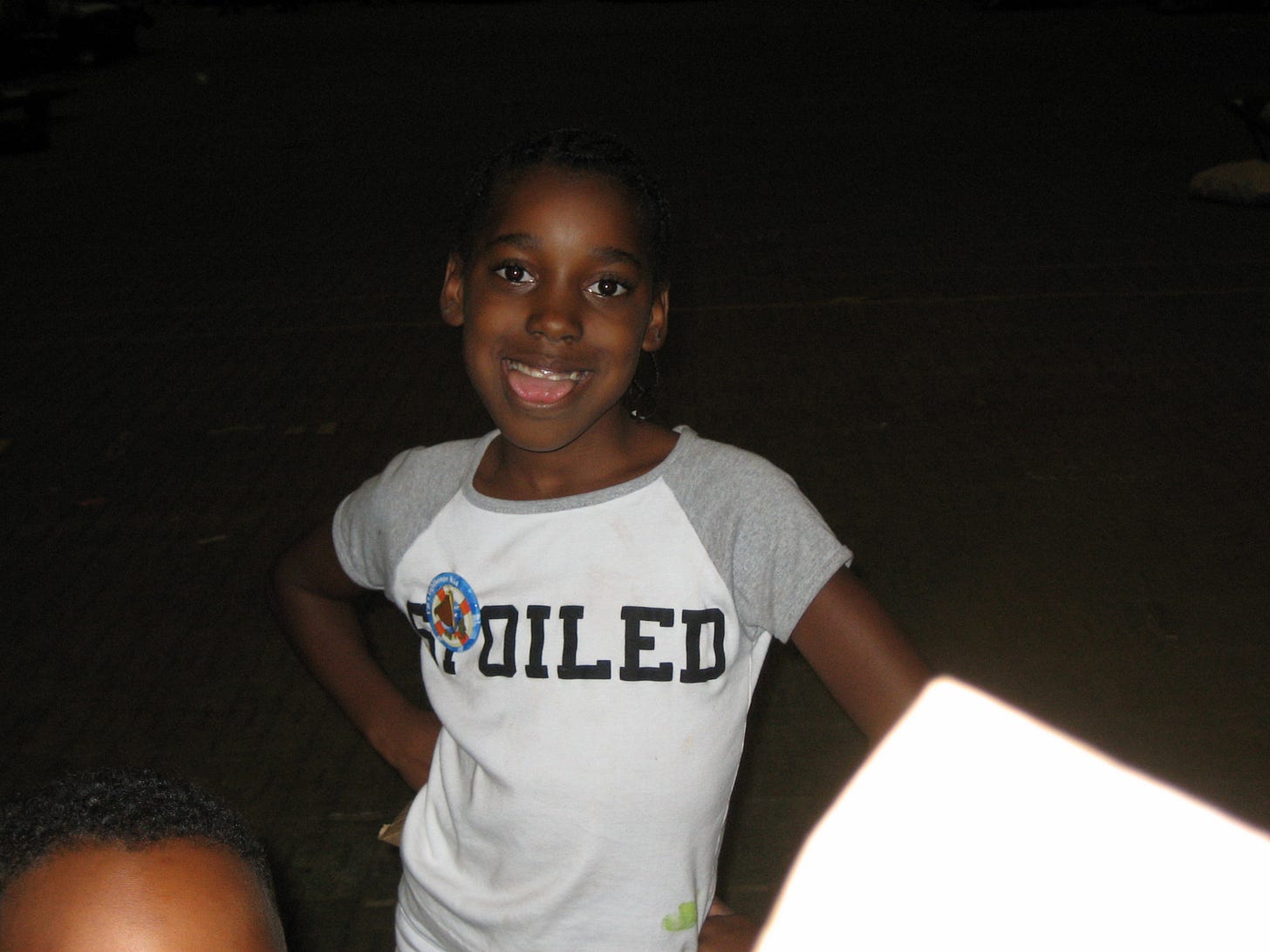After observing them for a few minutes, it became obvious who the ringleader was. She looked to be about 10 years old. I saw her order other kids, some half her age, some much older, to stand here, run there, say this, do whatever was needed next in the game she’d invented. A girl of slight build, her earth-colored arms and legs were perfectly proportioned to her tiny torso. Her tight corn rows pulled her hair back off her strong, angular face. Thick black eyebrows accentuated her eyes, dark ovals swimming in a sea of white that exactly matched her t-shirt emblazoned with the word “SPOILED” in big block letters. Whether it was her commanding voice, her unabashed fervor, or her clear sense of purpose, none of the other children challenged her authority.