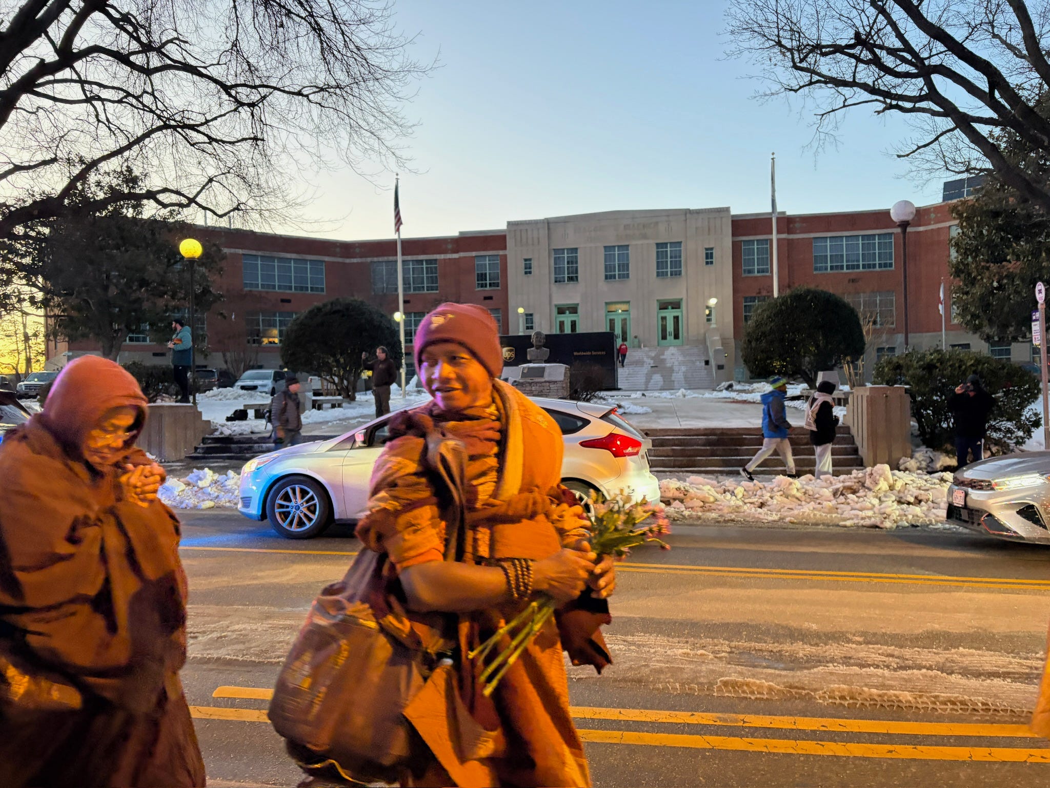 Later that afternoon, Wendy and I crossed the city ahead of the monks so she could photograph them in front of the school where she works as librarian. When we met them again on Lombardy Street, the mood was quieter but no less intentional. Familiar faces, including some of Wendy’s coworkers, had gathered. People spoke softly, gestured kindly, and paused as the procession passed.